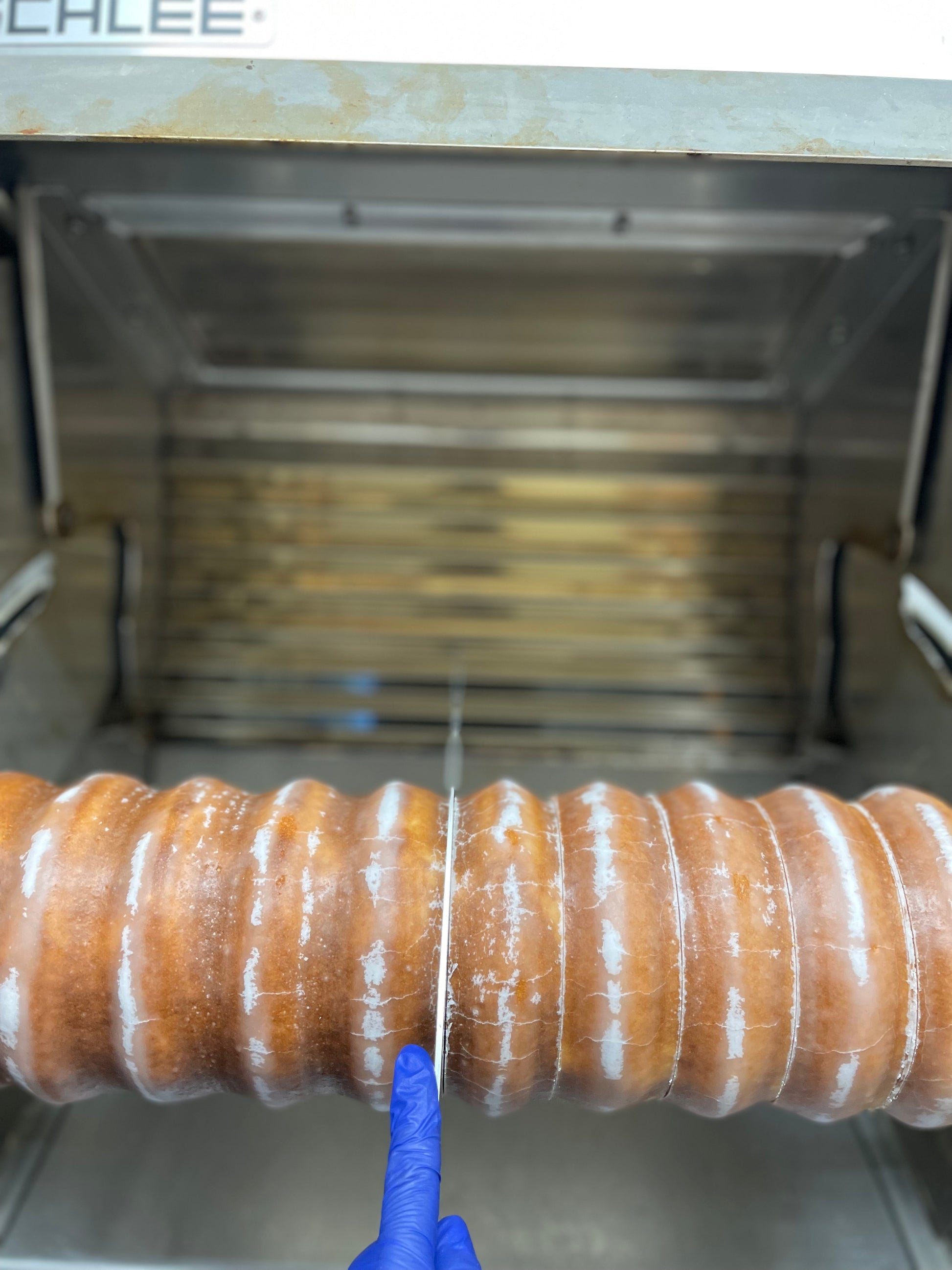 ヒダカではドイツで約6年間修業した、製菓マイスターの職人が、焼き上げからコーティング、輪切りのカットまで全て手作業で、心を込めて作っています。