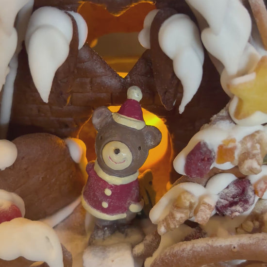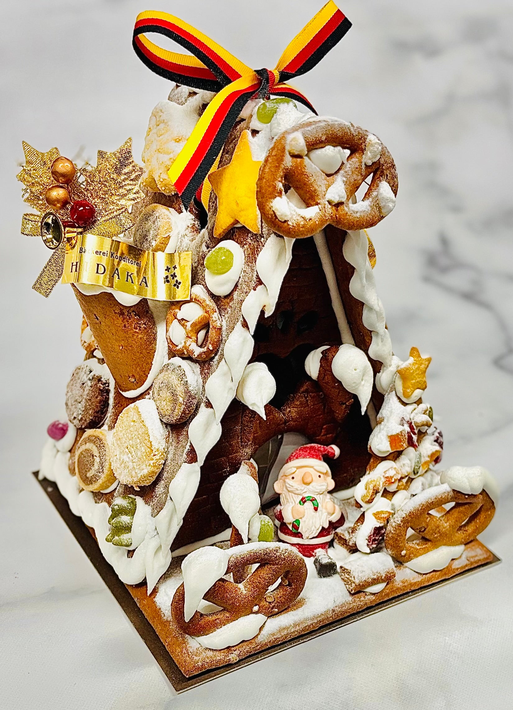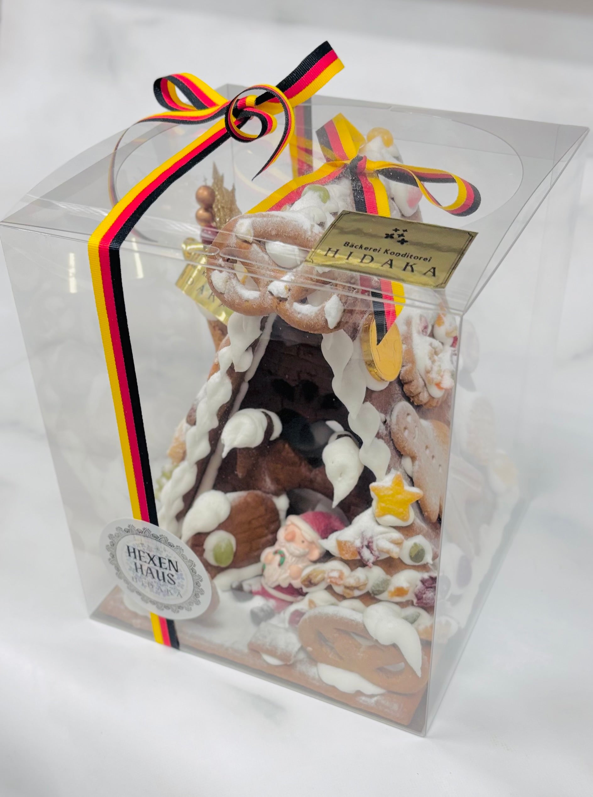 ドイツのスパイスの効いたレープクーヘン(蜂蜜のクッキー)生地で作った、まるごと全て食べられるヘクセンハウス(=魔女のおうち)です。