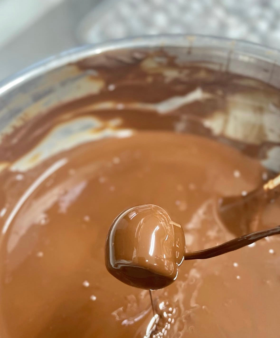 さらに職人が全工程を手作業で三層のクーベルチュールで包み込んでいきます。